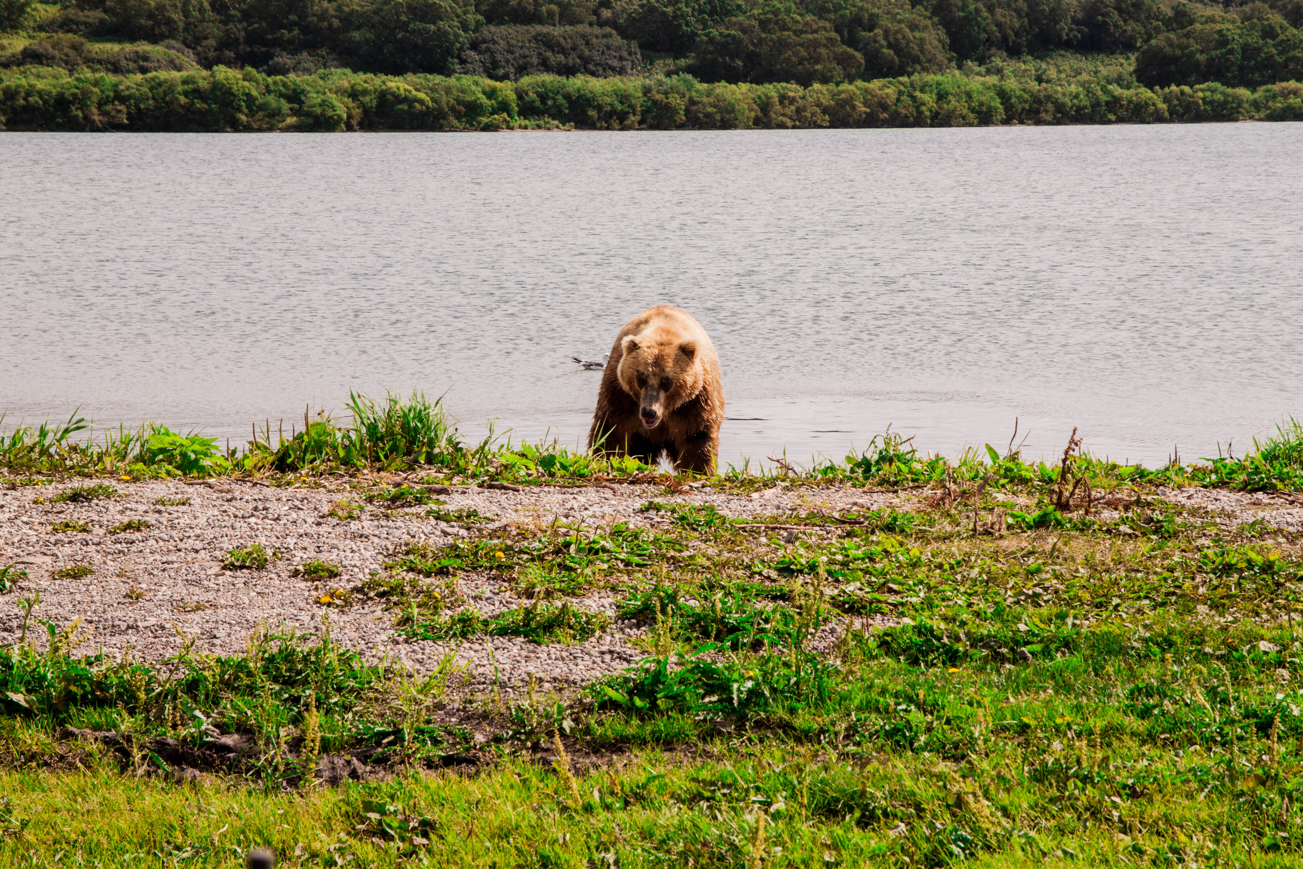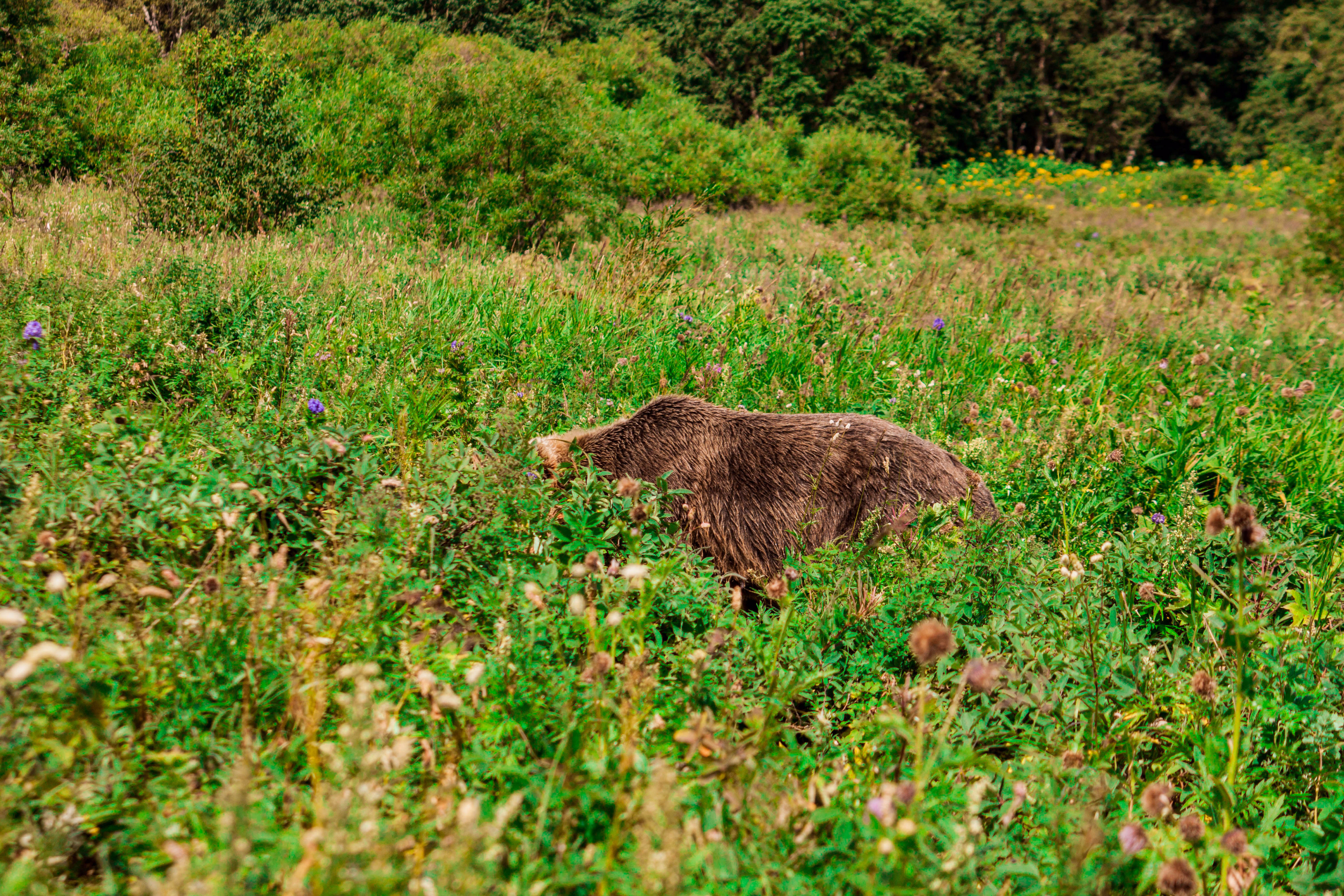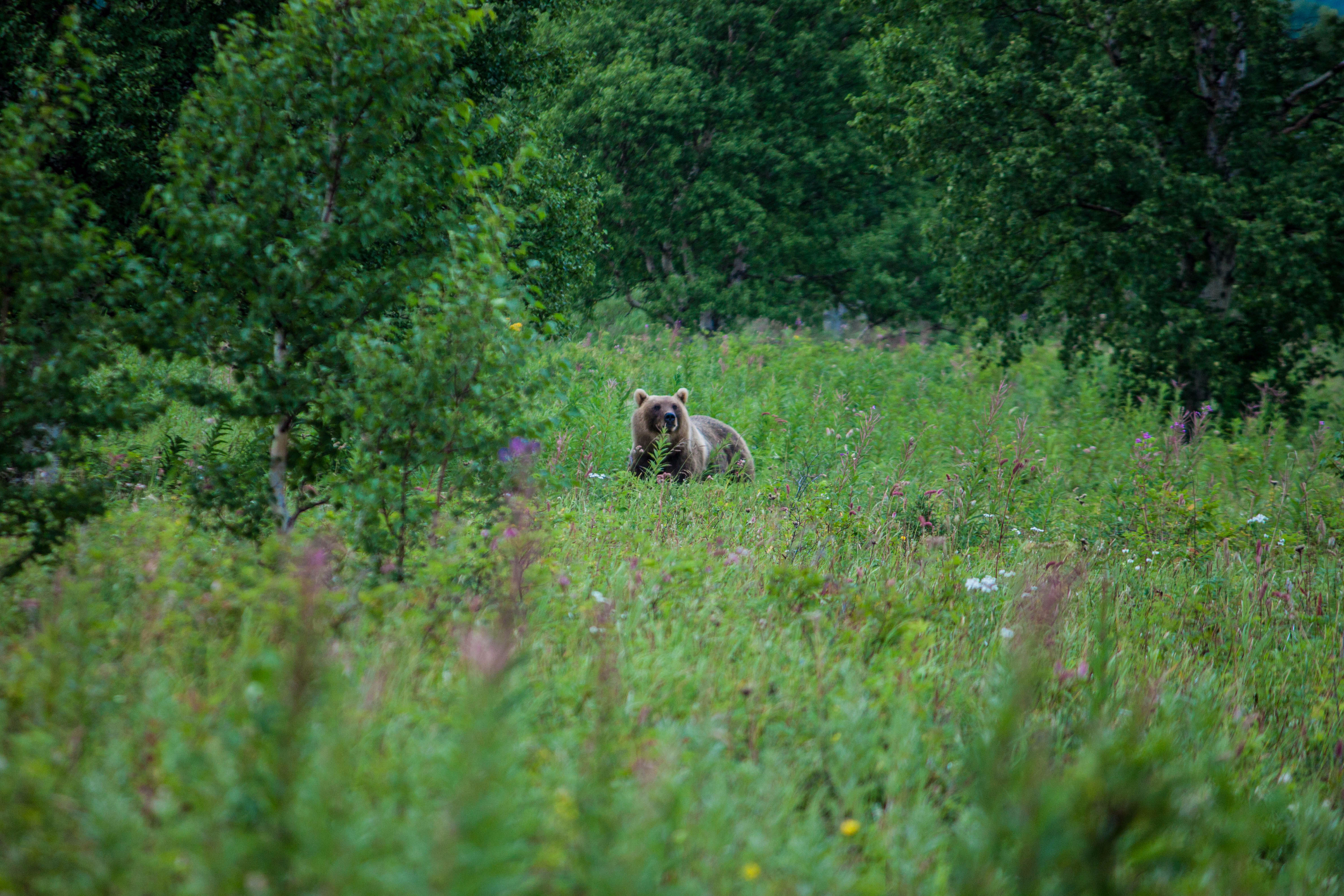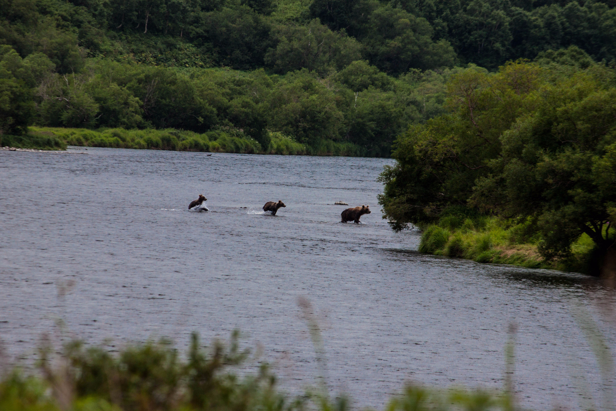 На этого мишку! :) Хотя, чтобы вы понимали, он просто идет примерно в 100-150 метрах от нас. А у нас — только баллончики от мишек… Короче, вот только из-за Камчатки иностранцы думают, что медведи бродят как собаки или кошки.