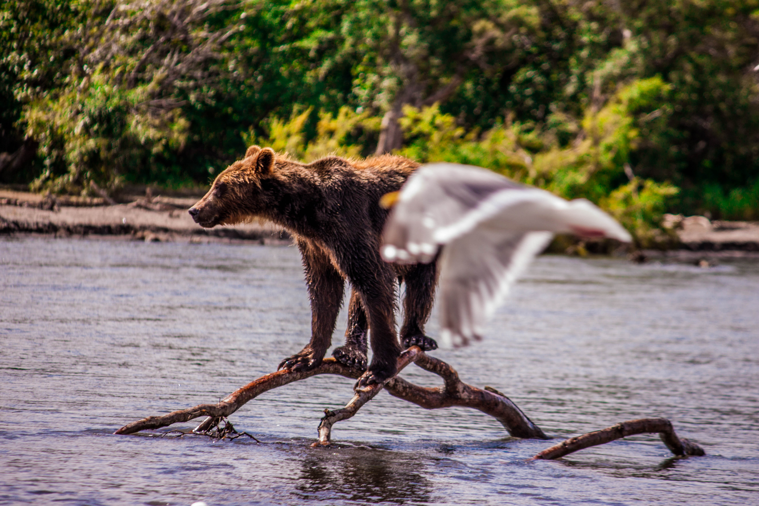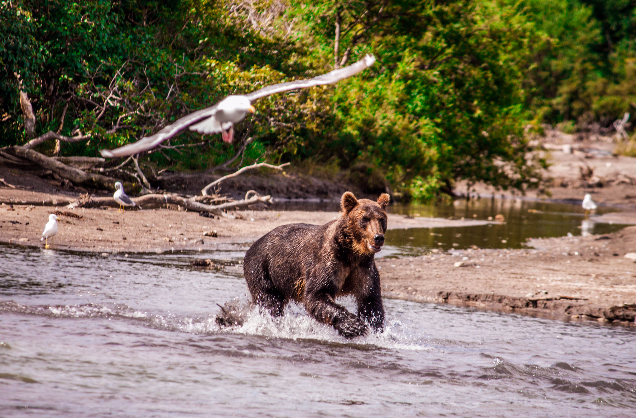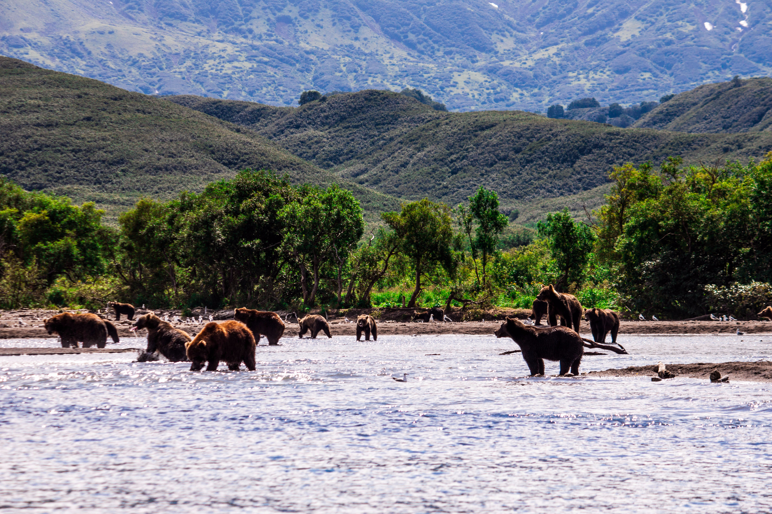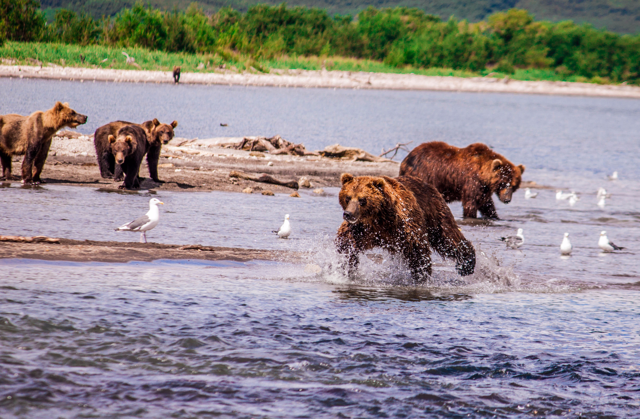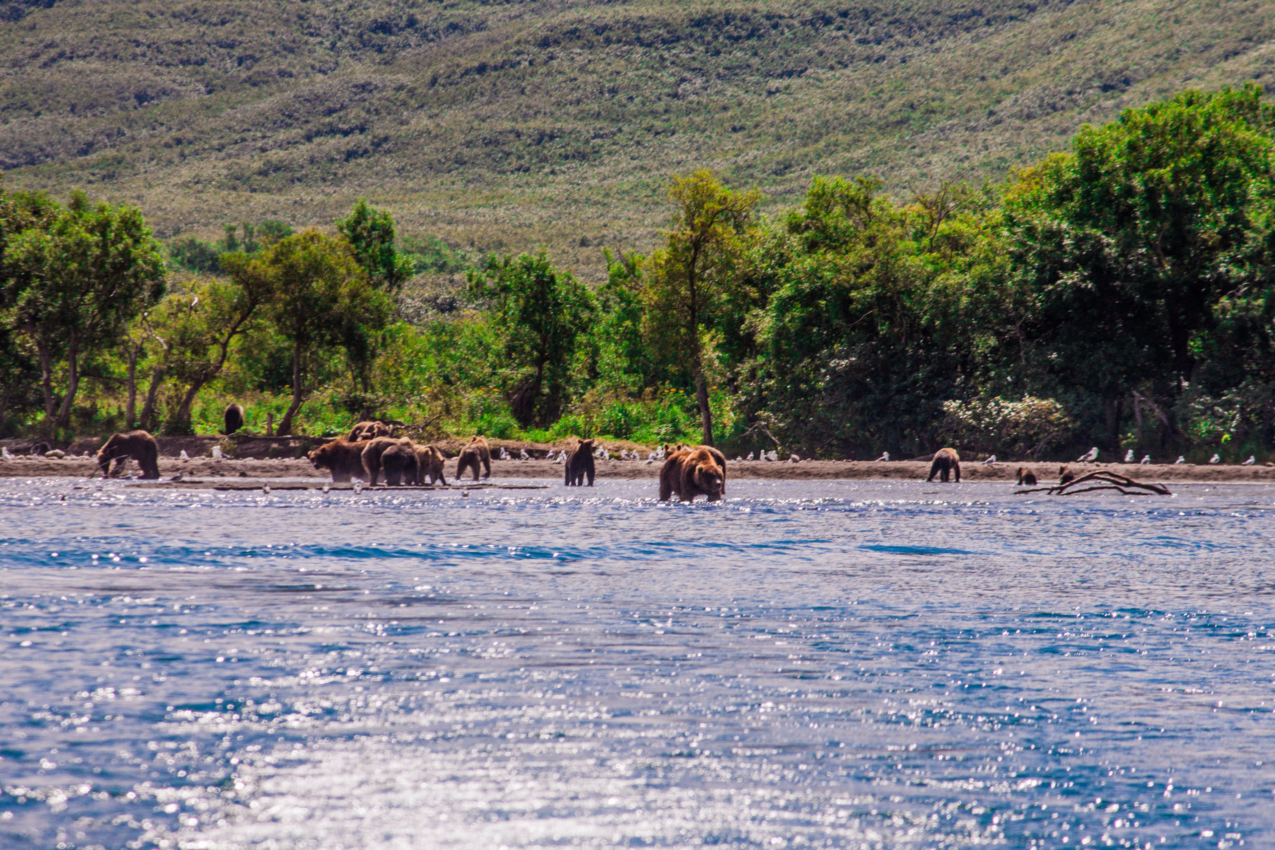На этого мишку! :) Хотя, чтобы вы понимали, он просто идет примерно в 100-150 метрах от нас. А у нас — только баллончики от мишек… Короче, вот только из-за Камчатки иностранцы думают, что медведи бродят как собаки или кошки.