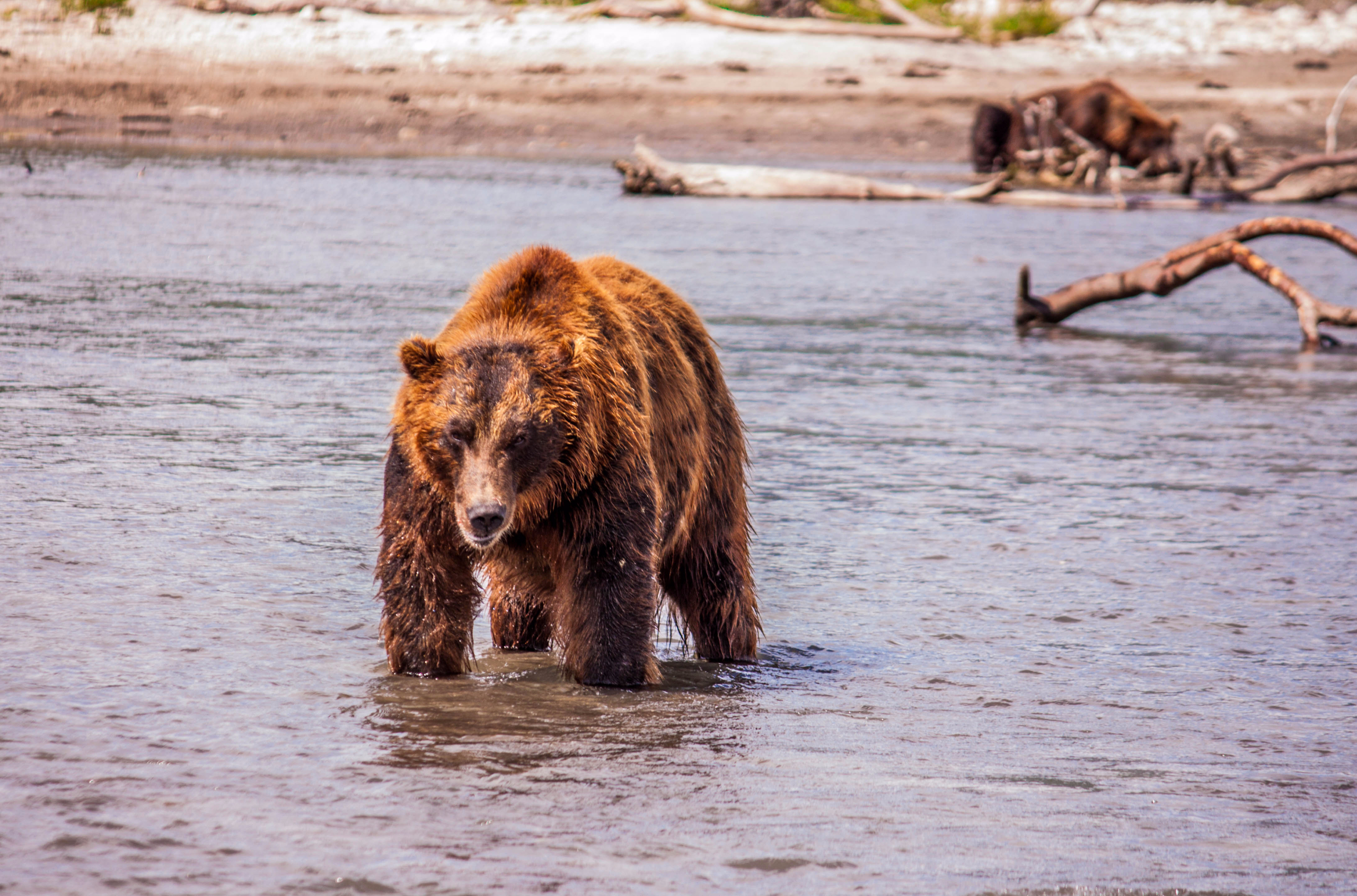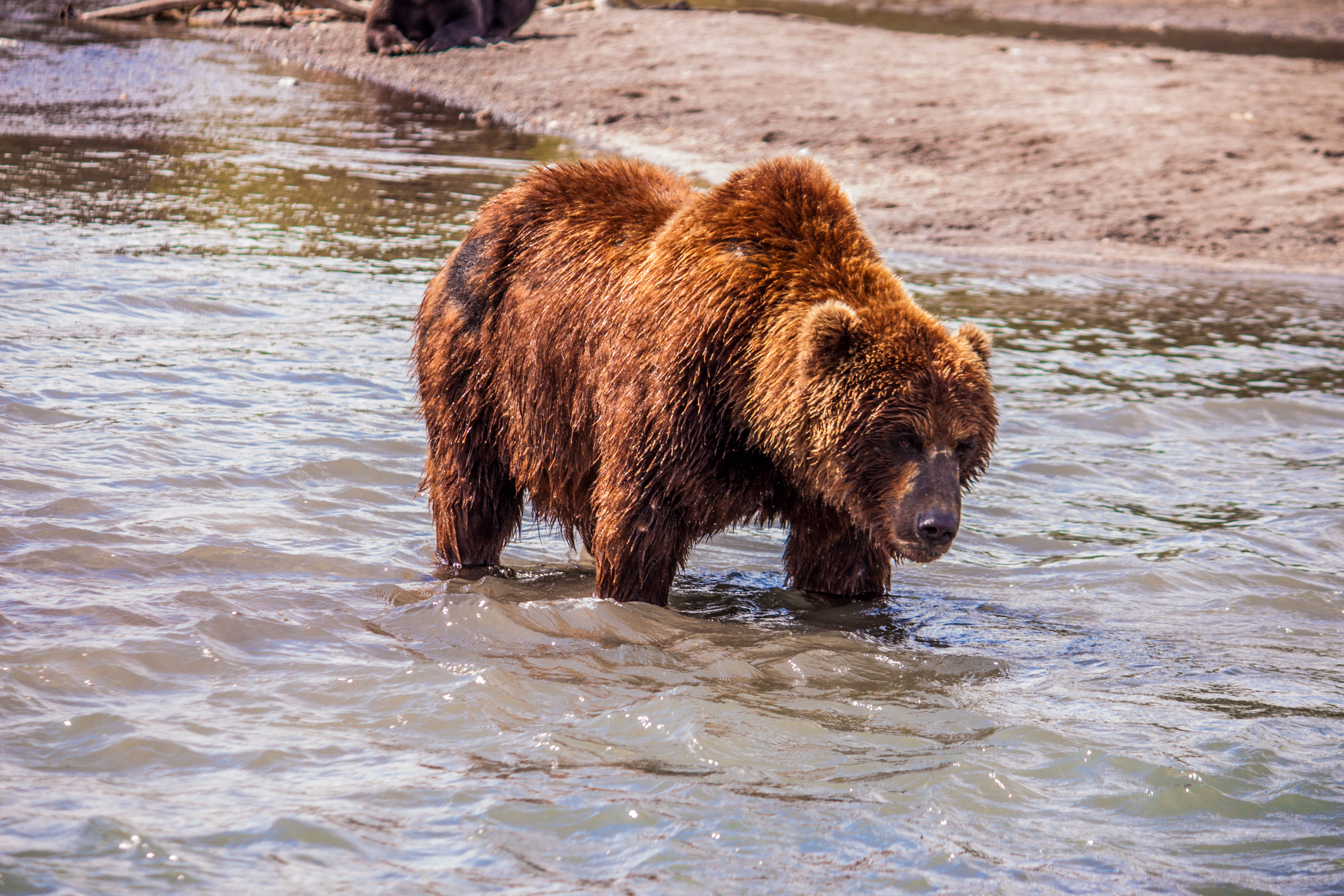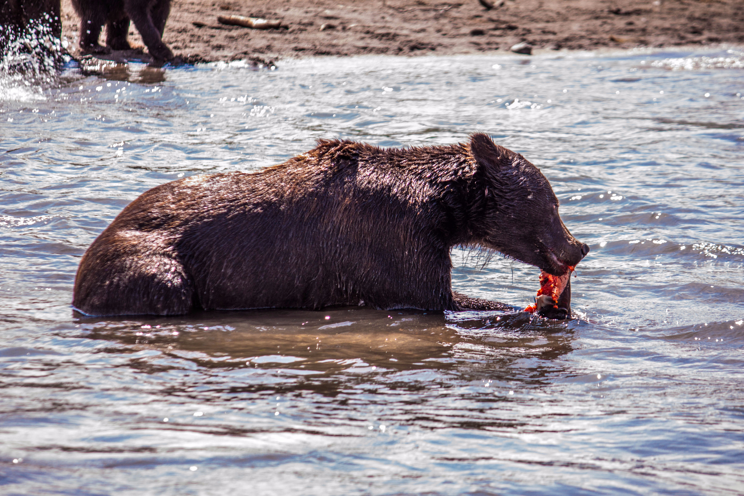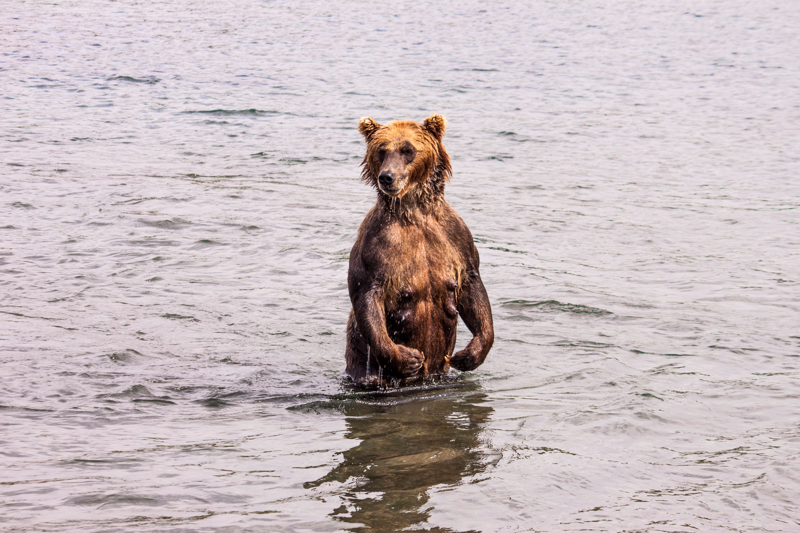 На этого мишку! :) Хотя, чтобы вы понимали, он просто идет примерно в 100-150 метрах от нас. А у нас — только баллончики от мишек… Короче, вот только из-за Камчатки иностранцы думают, что медведи бродят как собаки или кошки.