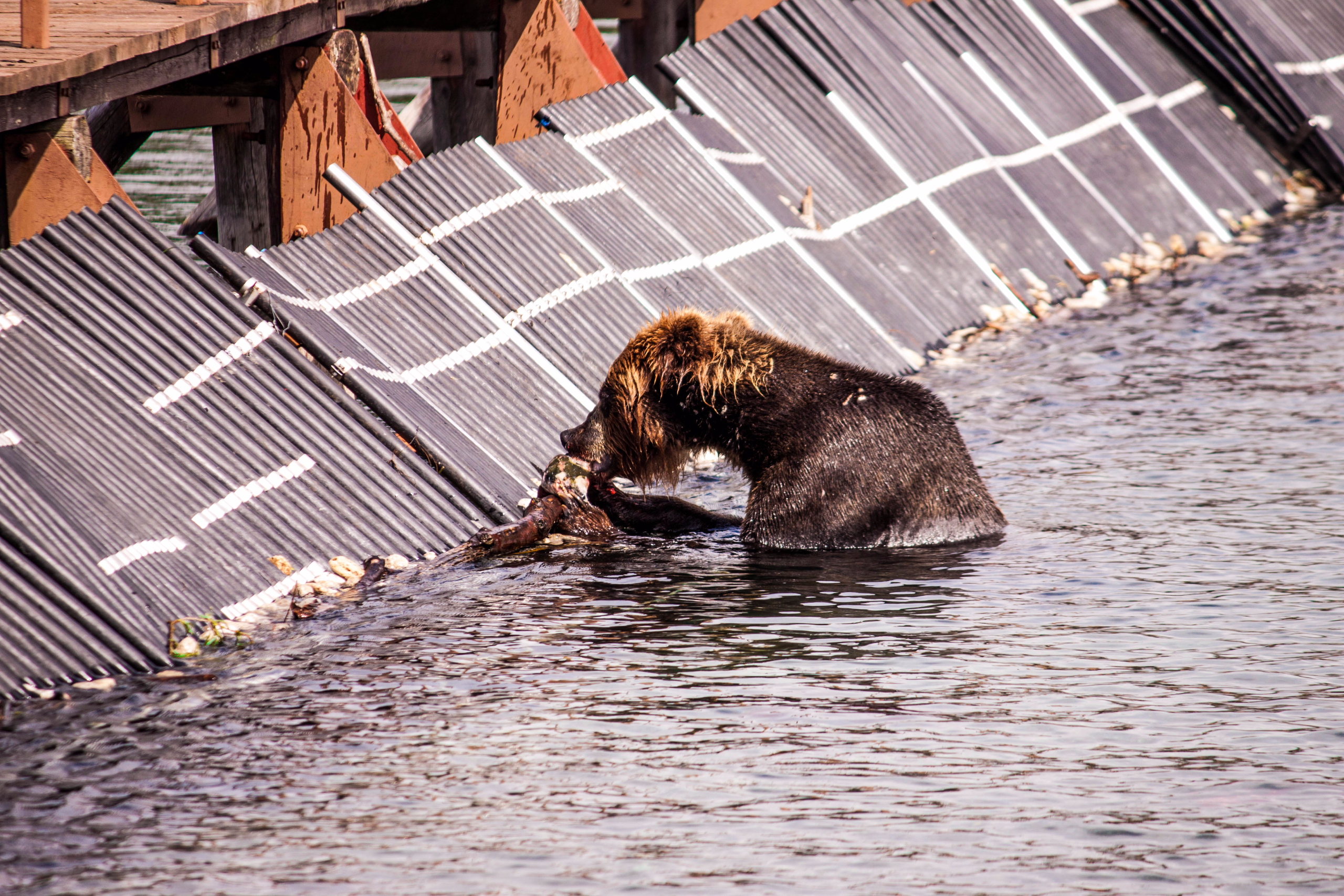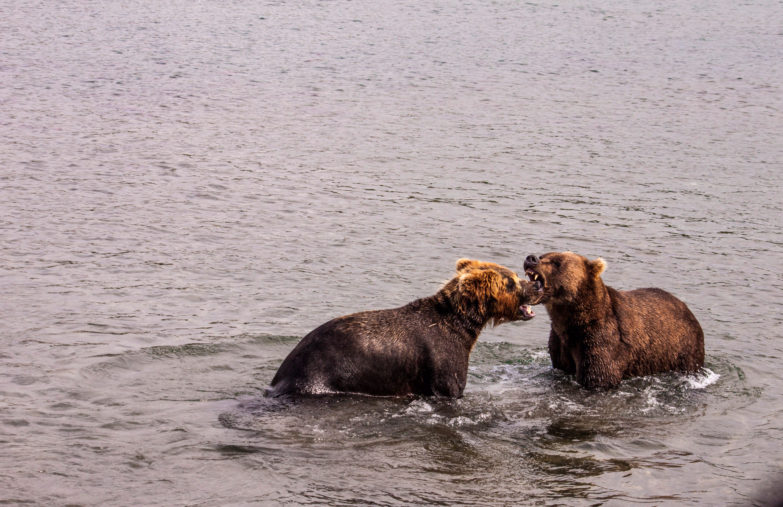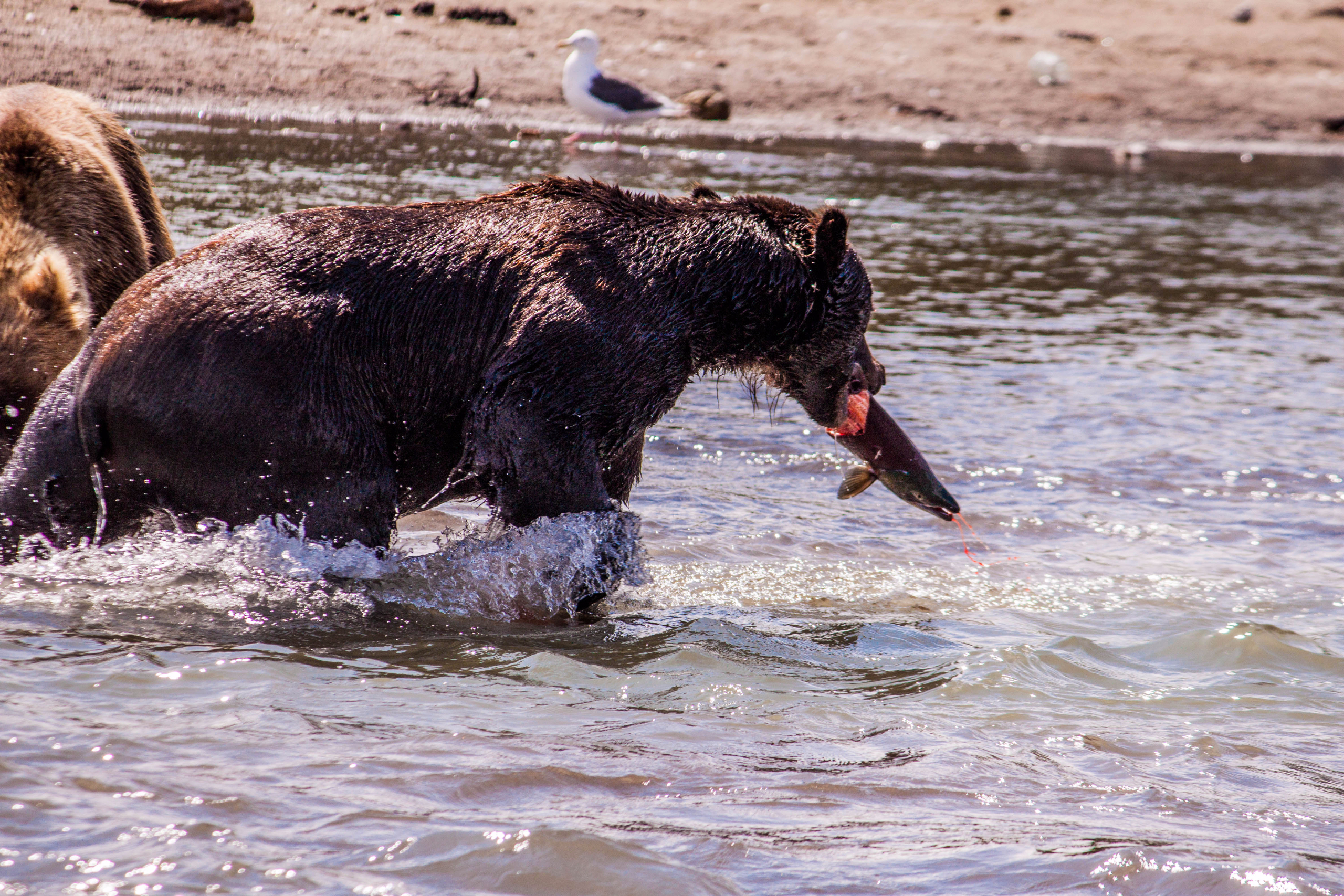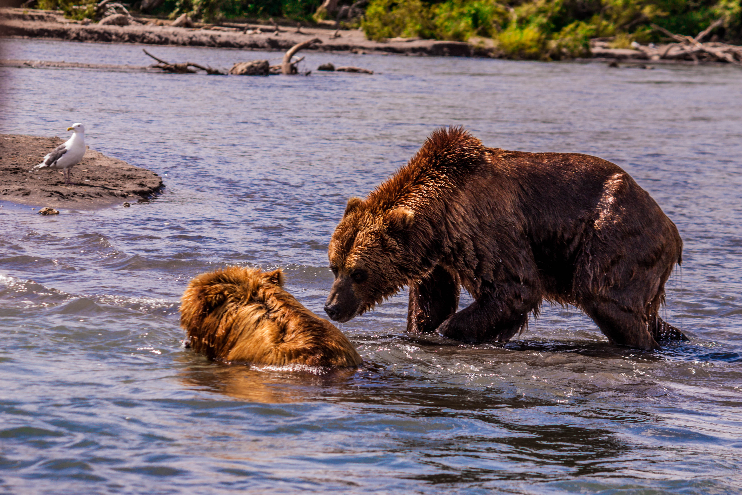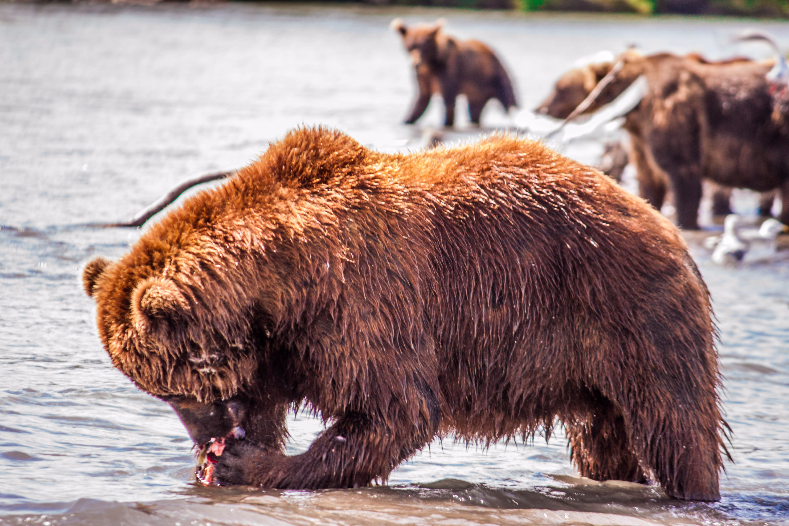 На этого мишку! :) Хотя, чтобы вы понимали, он просто идет примерно в 100-150 метрах от нас. А у нас — только баллончики от мишек… Короче, вот только из-за Камчатки иностранцы думают, что медведи бродят как собаки или кошки.
